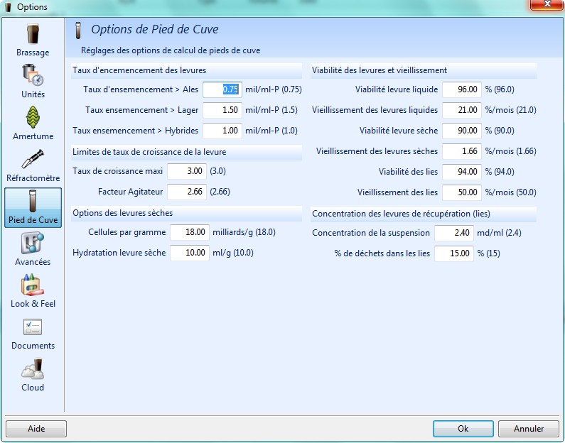 Les options de Pied de Cuve sont utilisées en interne aussi bien pour l'Outil Pied de Cuve que pour l'Onglet Pied de Cuve lors de la création de recette afin de calculer la taille et la viabilité appropriée des échantillons de levures et des starters. Changer ces options affectera à la fois l'outil et le calcul du pied de cuve des recettes.